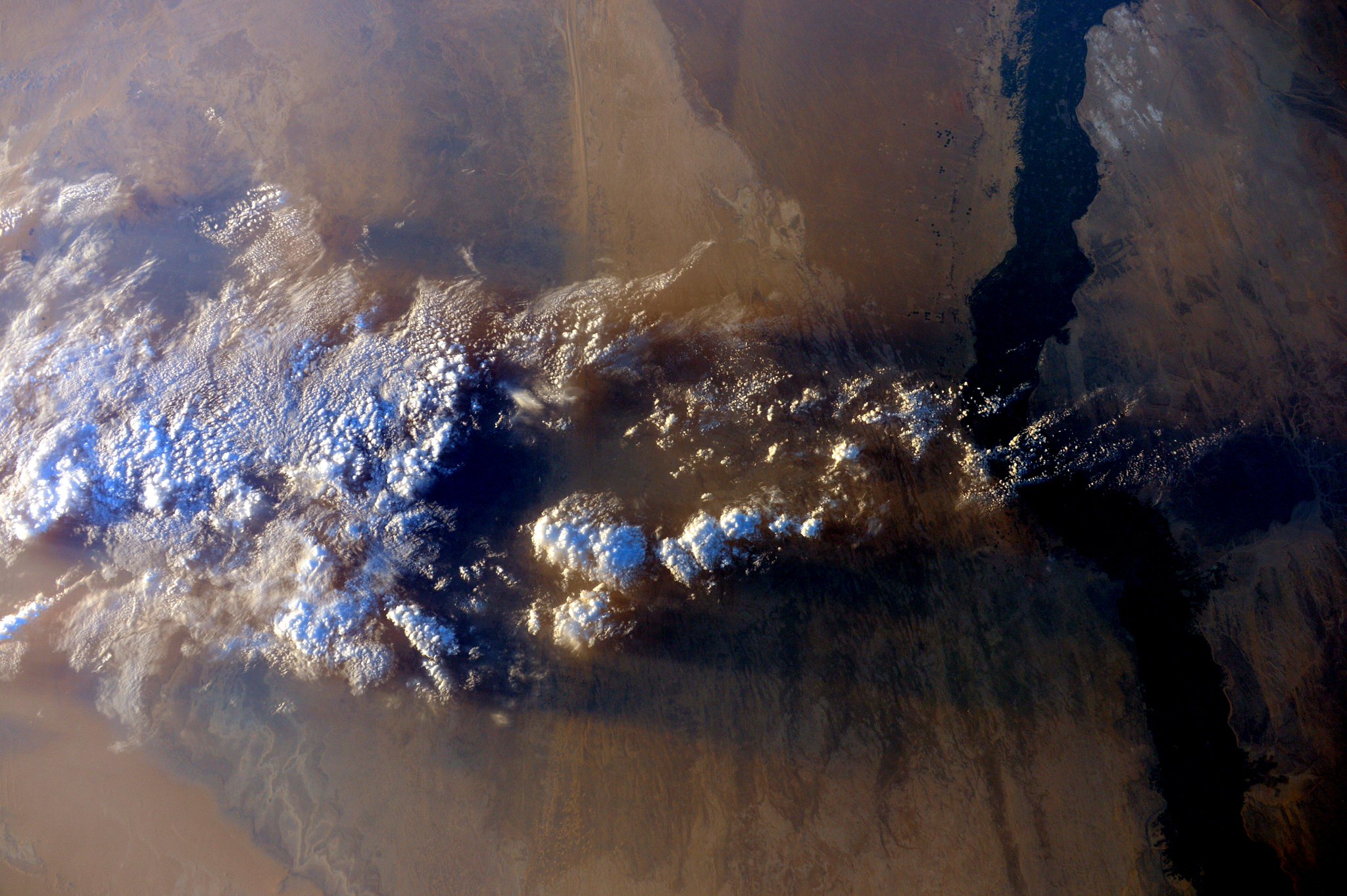 "Dlouhé stíny při soumraku nad Nilem."