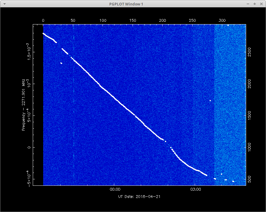 Pokračuje stúpanie smerom k prvému vrcholu apogee . Tieto údaje sú získané včera a nevykazujú žiadne výrazné periodické správanie vo frekvencii alebo amplitúde signálu, predchádzajúce dni vykazujú podobné charakteristiky.