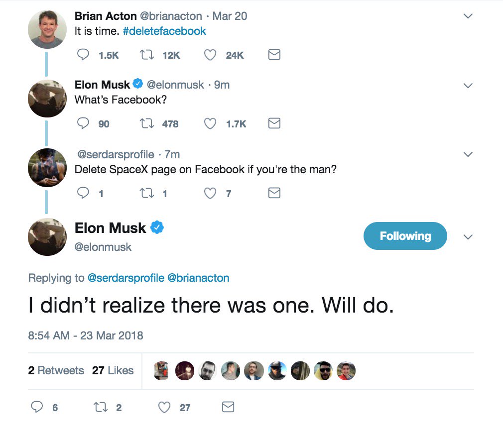 Nevím, fb účet jsem nikdy neměl a žiju taky. Pokud Zuckerberg vědomně poskytoval privátní údaje uživatelů jeho síťe třetím stranám a došlo to až tak daleko, že to ovlivnilo prezidentské volby v USA, tak je to asi hodně špatně. Nedivím se, že se zvedla vlna protestu spojená s mazáním účtů. Pokud má Musk & SpX & Tesla i jiné komunikační kanály pro veřejnost a své fanoušky (twitter, youtube, instagram, flickr, diskusní fóra, homepage), tak FB klidně můžou postrádat a přidat se k protestu. Osobně Muskovo rozhodnutí hodnotím kladně.