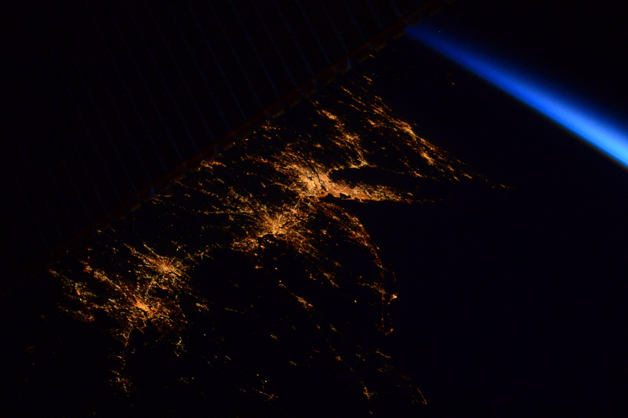 "Americké východní pobřeží od DC po Boston mi před východem slunce mizí za solárními panely."