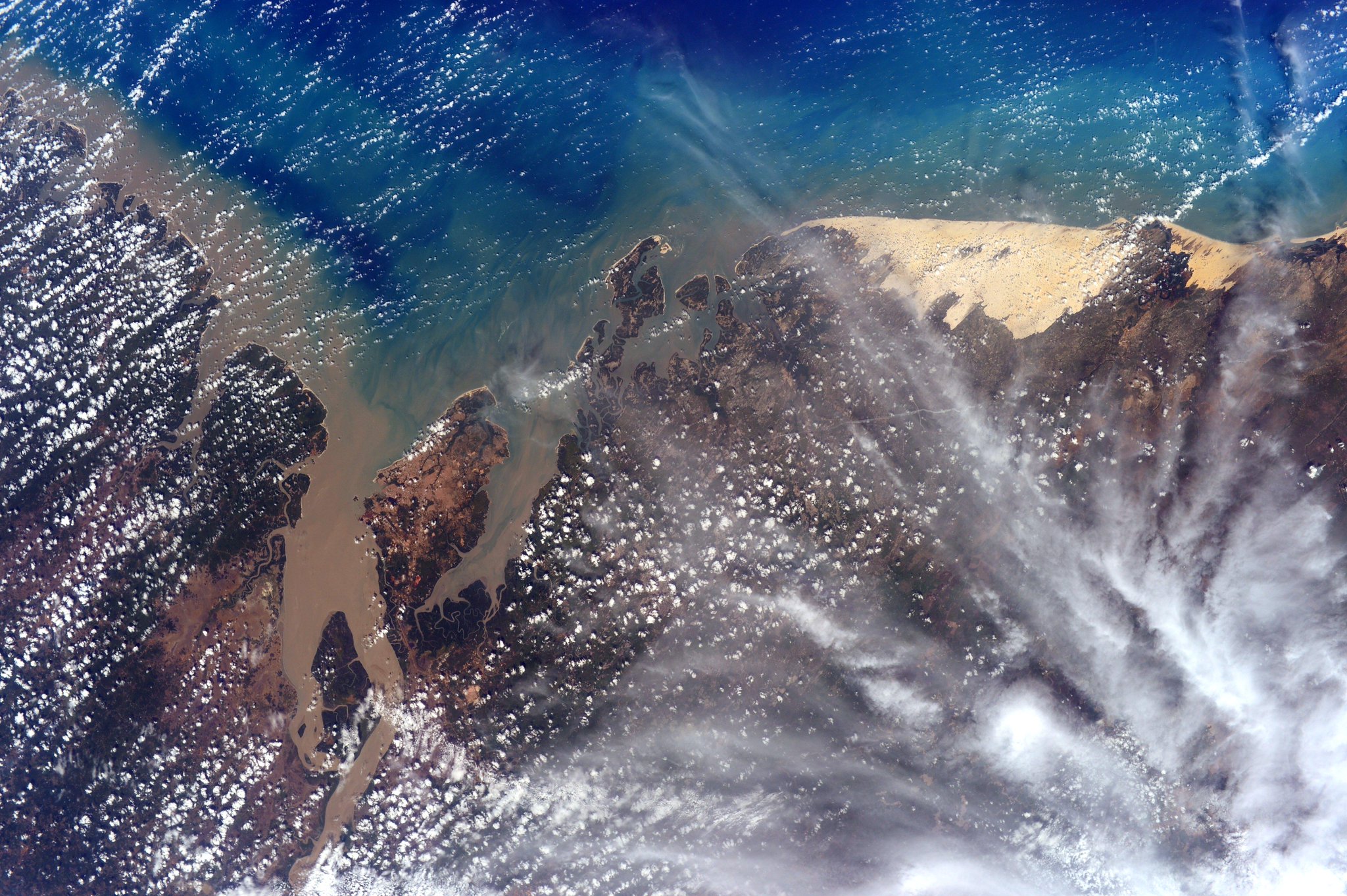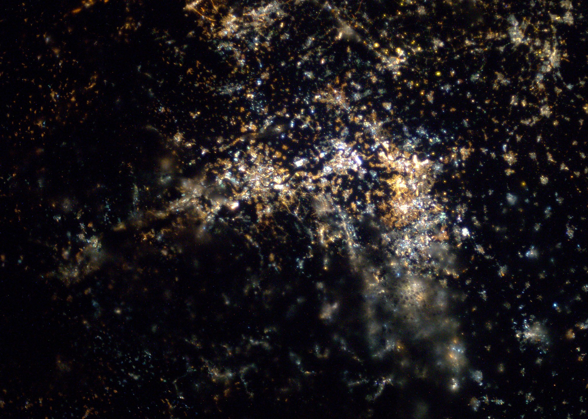 "Pohled podél Rýnu od Kolína po Duisburg a známou rúrskou oblast. Zdravím Německo a Evropské středisko astronautů."