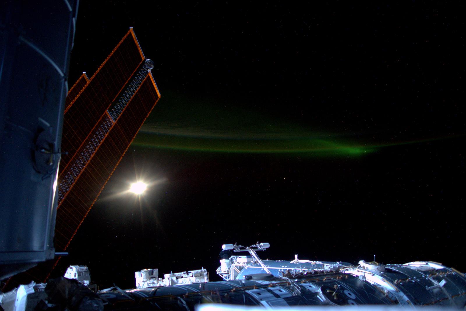 "Polární záře v dáli a vesmírná stanice zalitá měsíčním světlem."