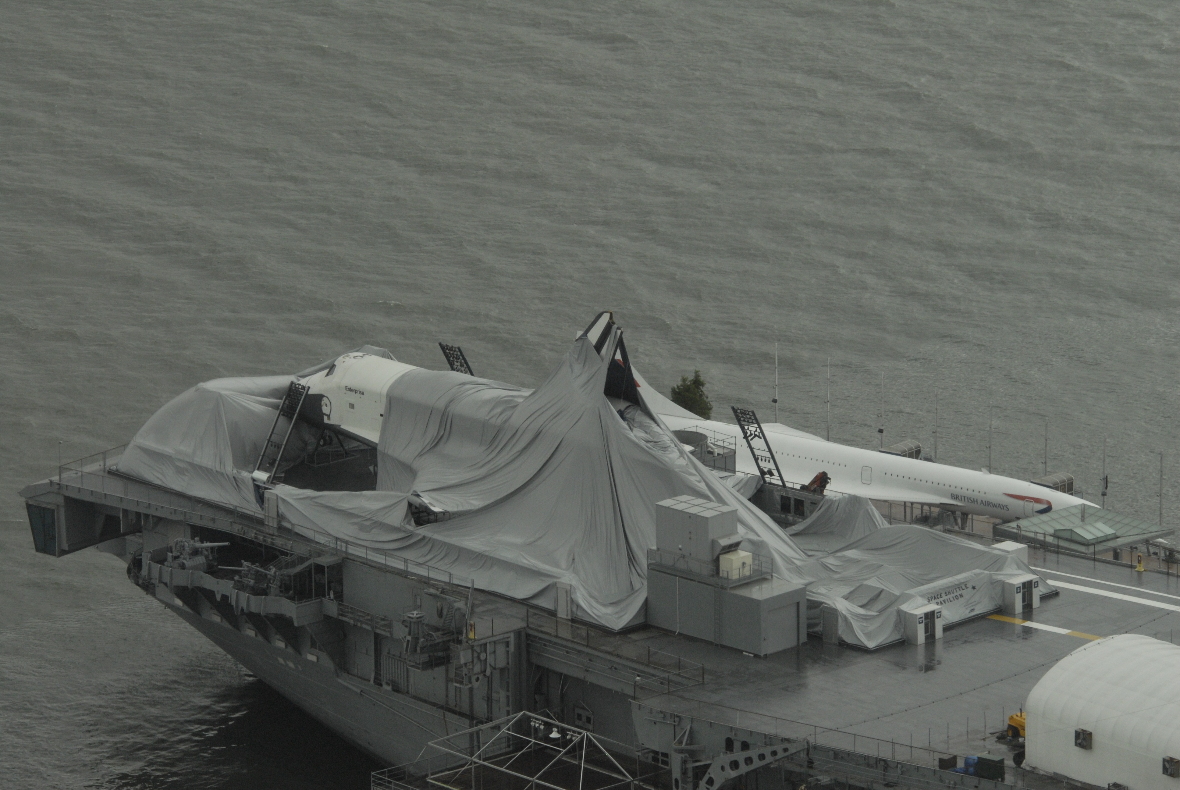 Hurikán Sandy si už stihl poškodit i raketoplán Enterprise. Na prvních obrázcích je raketoplán ukryt pod plachtou, ale pozdější fotografie už ukzuje poškozený vertikální stabilizátor a poslední fotka chybějící kryt/panel nákladního prostoru (ten šedý flek) a pravděpodobně není všemu konec