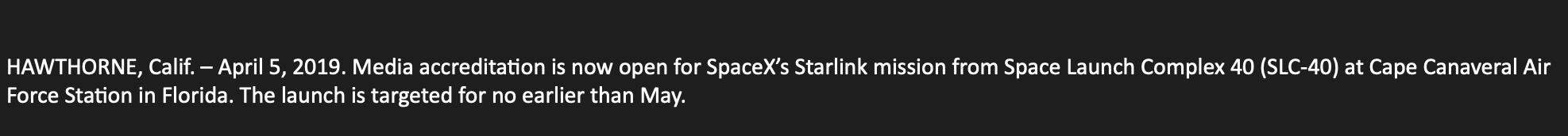 SpaceX nedávno zažádalo FCC o udělení licence pro start Falconu 9 z rampy SLC-40 na Floridě a následné přistání prvního stupně na plošině OCISLY, která se bude nacházet přibližně 600 kilometrů od pobřeží. Podle webu NASASpaceFlight jde o vůbec první misi vyhrazenou pro satelitní konstelaci Starlink. Pokud stále platí informace z listopadu minulého roku, tak by satelity měly obíhat na oběžné dráze ve výšce 550 kilometrů se sklonem 53°, přičemž Falcon 9 by je měl dopravit jen do výšky 300-350 km. Je tedy docela překvapivé, že se má OCISLY nacházet až 600 km od pobřeží, což bežná vzdálenost při misích na GTO, ale dalo by se to vysvětlit velmi vysokou hmotností nákladu. Zatím nevíme, kolik satelitů bude při jednom startu vyneseno, ani neznáme jejich přesnou hmotnost (poslední informace hovoří o 386 kg/kus, ale to bylo v době, kdy měly satelity jiné parametry a měly se nacházet na vyšší dráze). Ke startu by mělo dojít v polovině května.