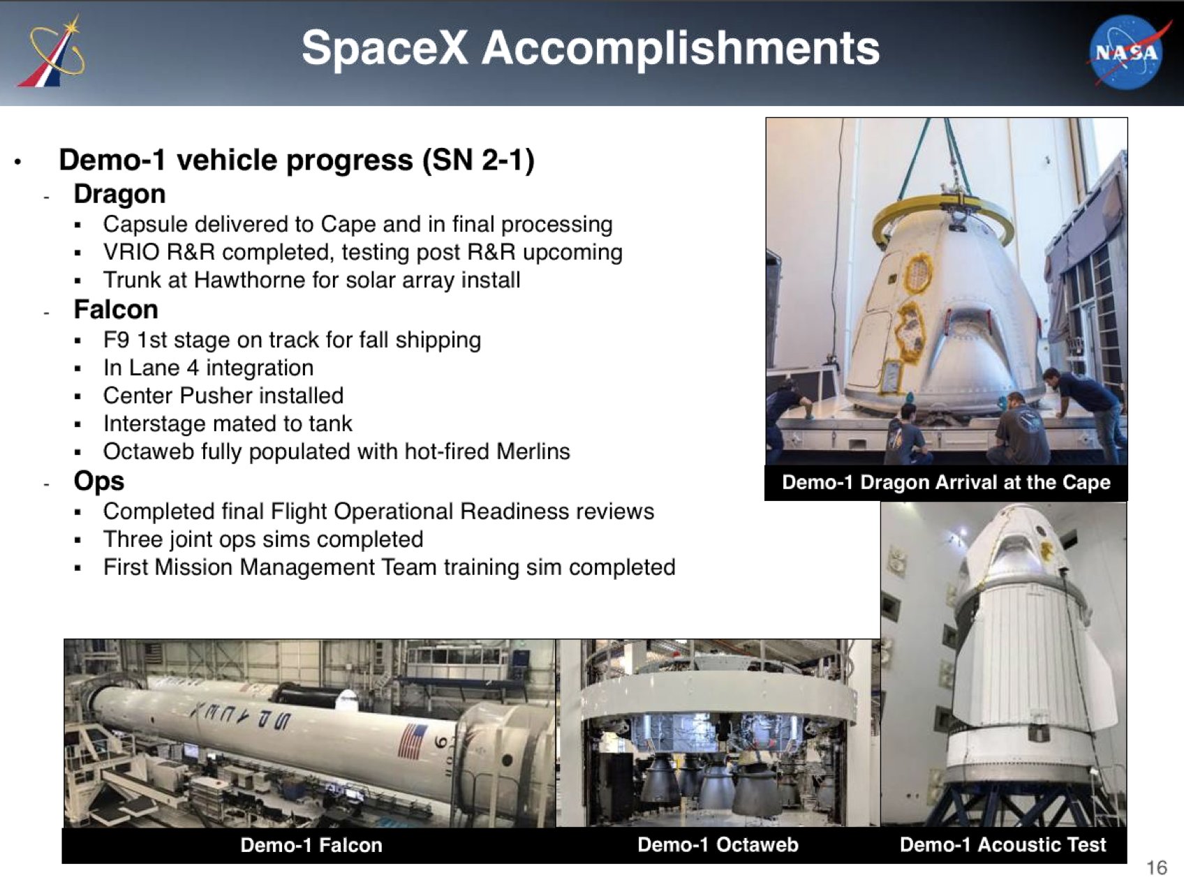 První demonstrační mise Crew Dragonu proběhne nejdříve na podzim a test úniku Dragonu tím pádem někdy na přelomu 2018/2019.