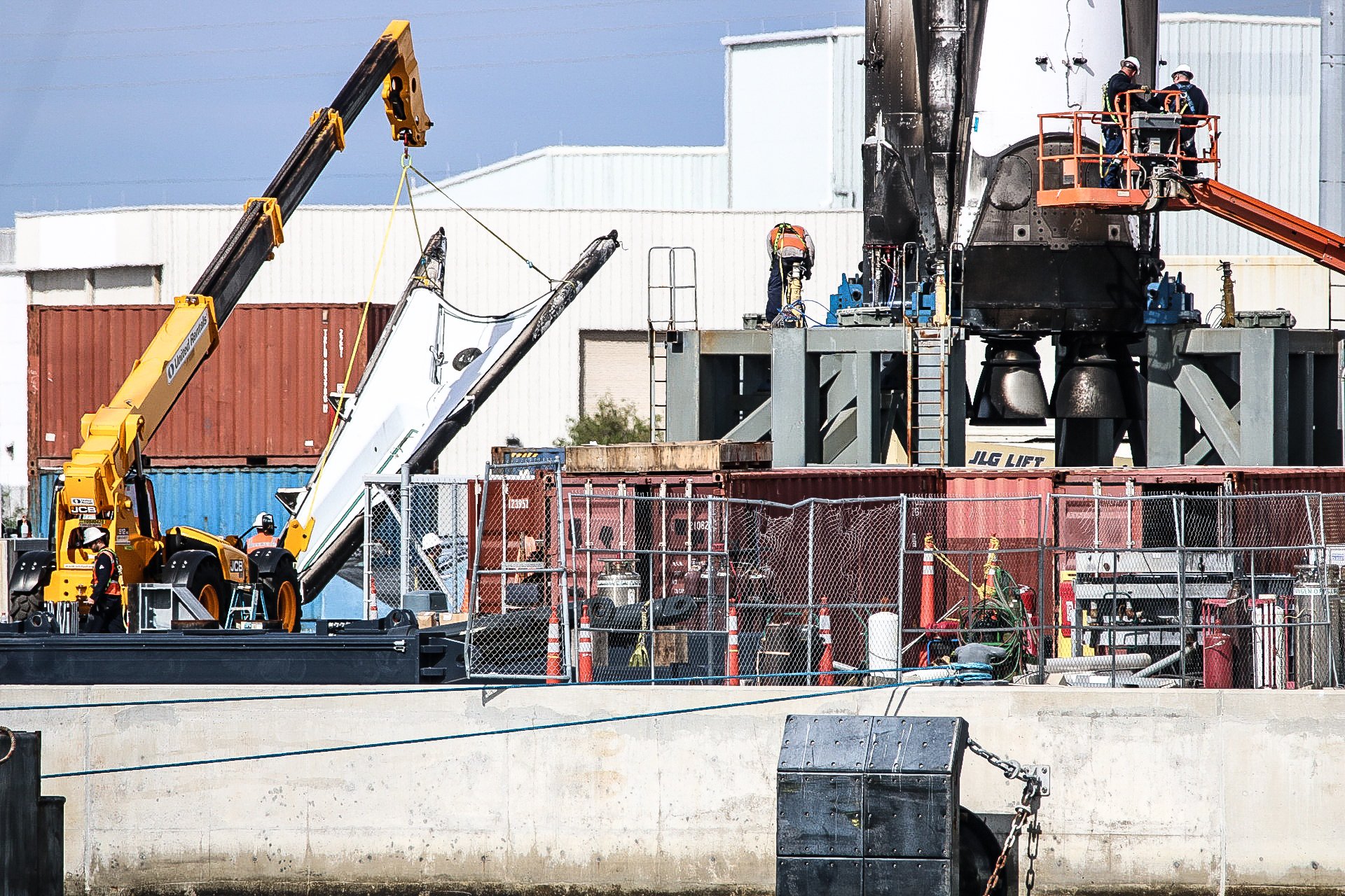 Celkový pohled na vykládku z dronu. Před octograberem na břehu se rýsuje cosi podobného tvaru... že by náhrada?