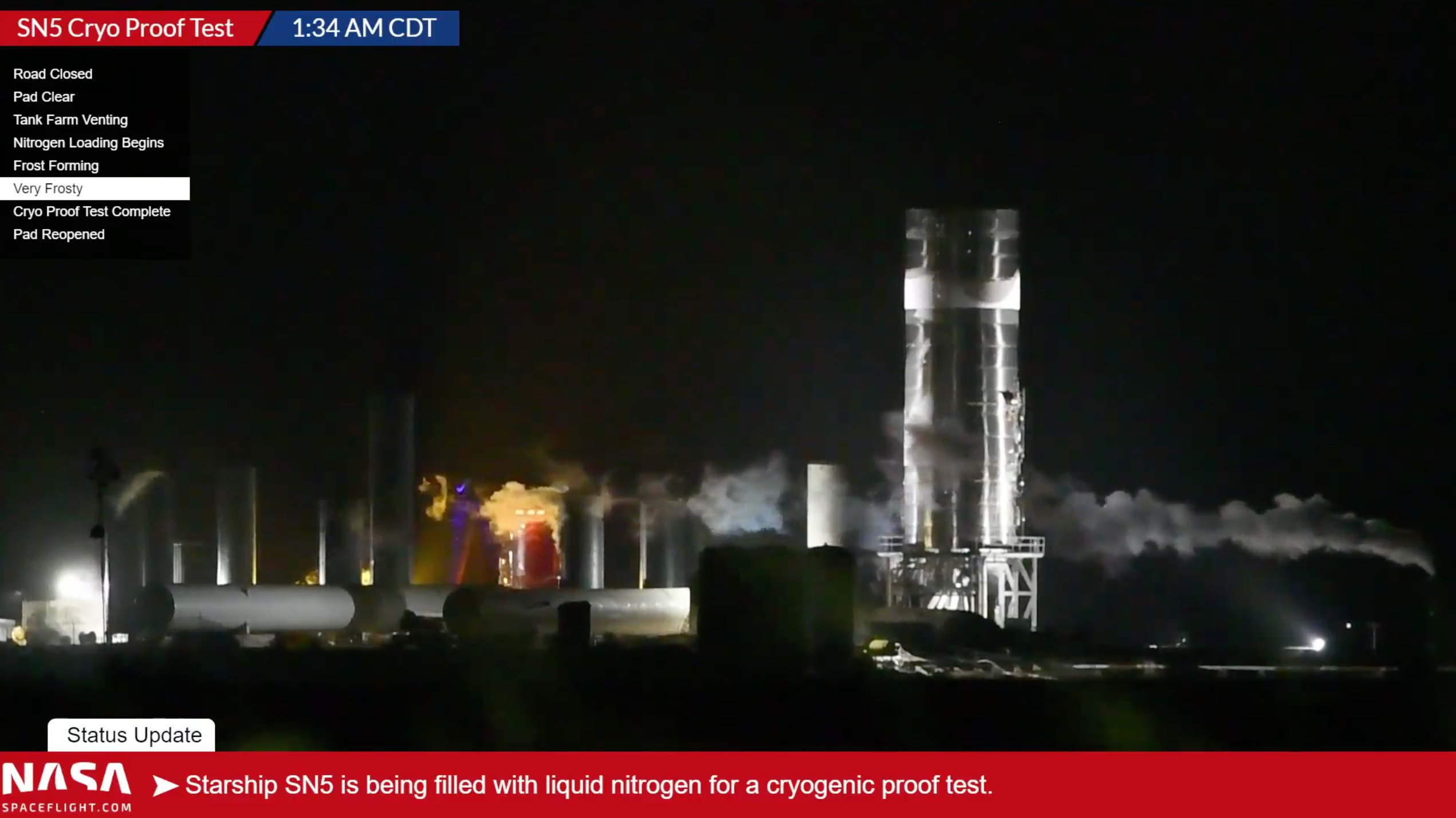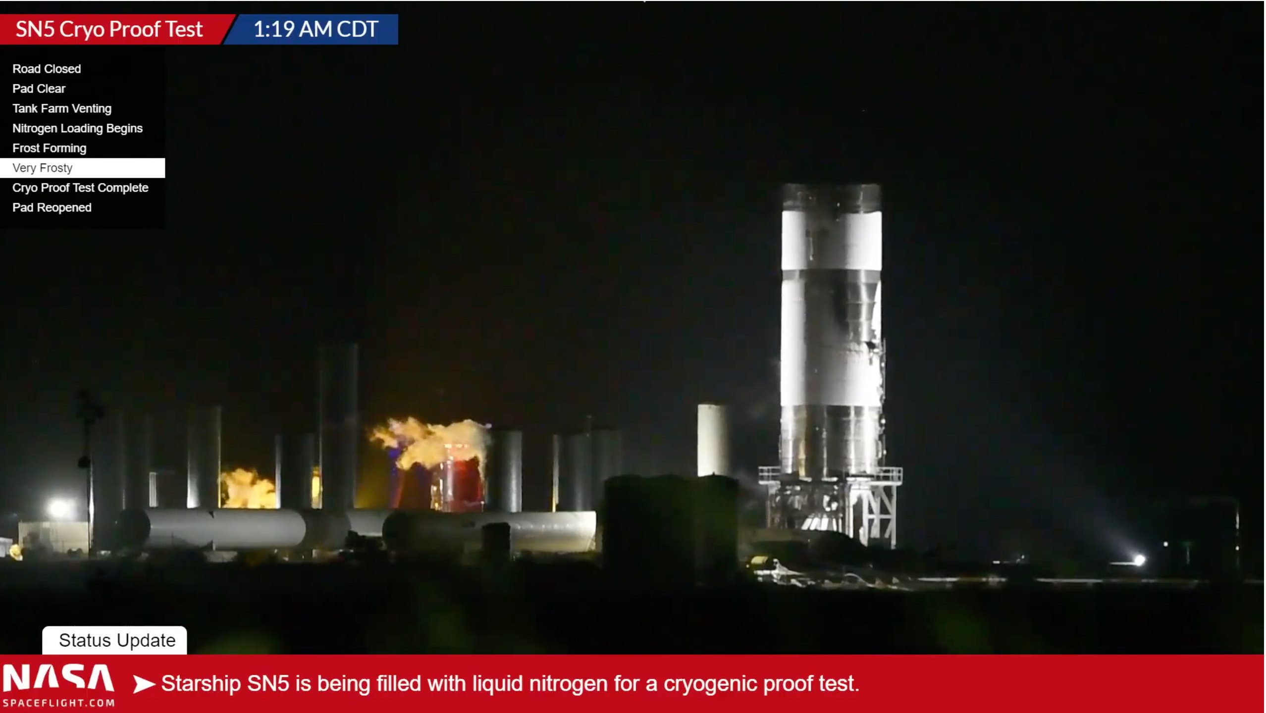 SN5 právě teď podstupuje svůj první kryo-test. Podle svědků proběhlo plnění velmi rychle a je opět odtankováno.