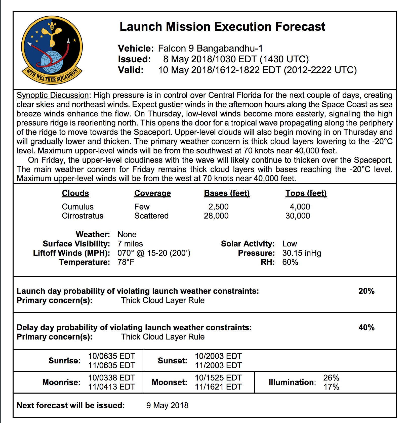 Předpověď počasí na 7. i 8.5. byla stažena z webu 45. Space Wing. Stejně tak NOTAMy na oba dny byly zrušeny.